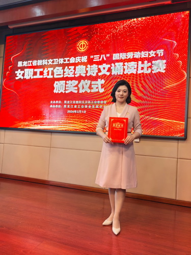 3月1日,由黑龙江省教科文卫体工会举办的庆祝“三八”国际妇女节——女职工红色经典诗文诵读比赛在哈尔滨圆满落幕,我校教师李慧在比赛中荣获二等奖!