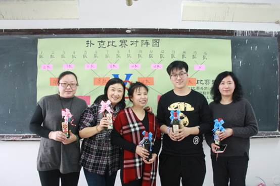 会议结束后,经过现场抽签等环节,教师们带着欢声笑语进入到经过精心设计和布置的扑克比赛活动现场。比赛活动现场,气氛热烈,掌声笑声欢呼声不绝于耳。选手们密切配合,精确运筹、沉着应战,对阵双方比牌技、比智慧,赛友谊、赛成绩。旁观和加油助威的教职工认真观战、积极互动。同台竞技的教师,再一次感受着同事之间的情谊和合作,集体的温暧和力量。按照事先设定好的比赛规则,经过紧张刺激的争夺和层层淘汰,产生出4个获奖小组,其中第一名一组,第二名一组,第三名两组。获奖队伍纷纷拍照留念后,整个活动在愉快的气氛中落下帷幕。